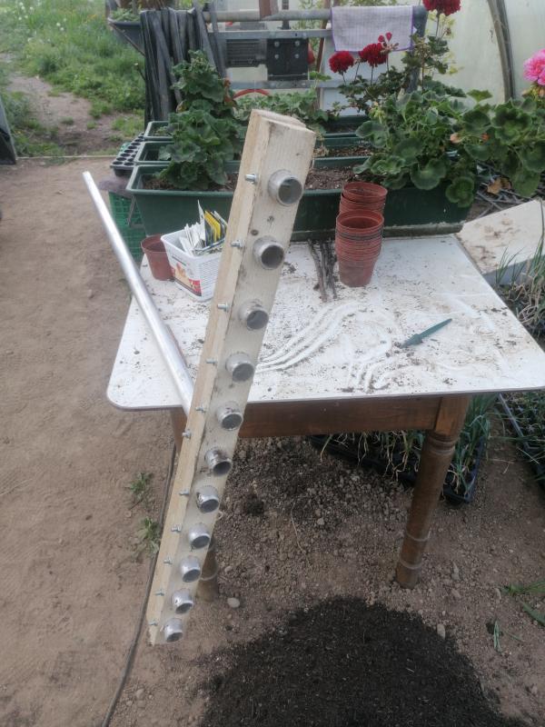 Und um die Bohnen stecken zu können habe ich eine Art Handwerkzeug gefertigt. Hiermit kann ich 11 Löcher im abstand von 7cm auf einmal ausstanzen.