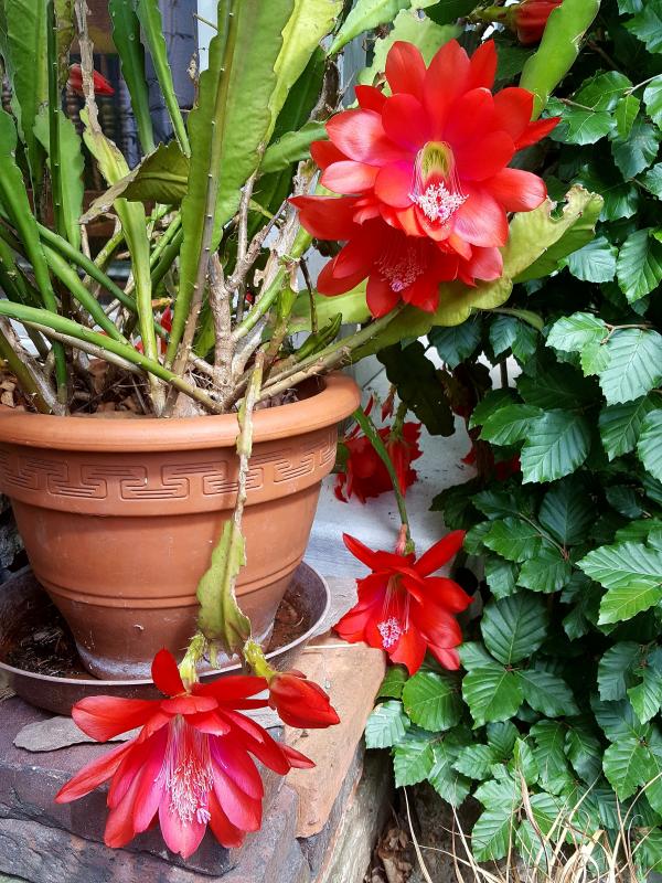 Eher unansehliches Objekt die meiste Zeit des Jahres, zZt aber der Hit im Topfgarten : Orchideen Kaktus ( Epiphyllum )