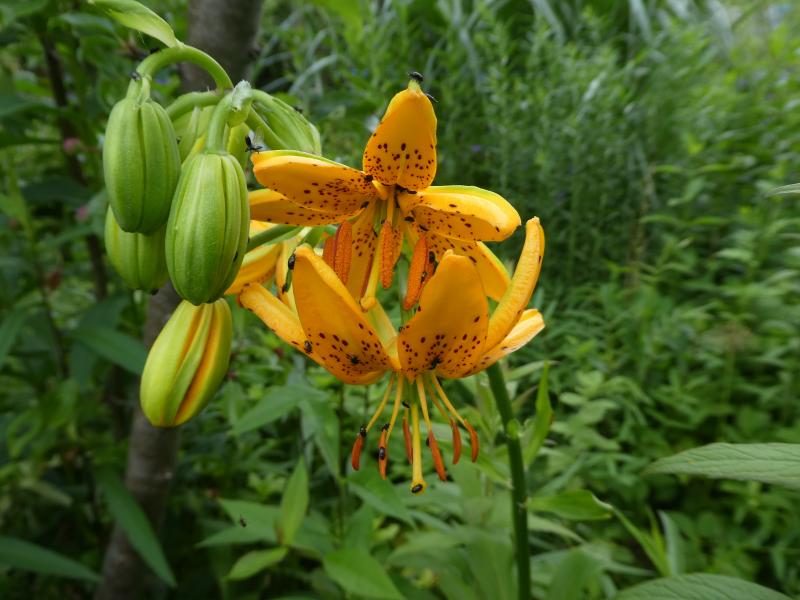 Die Hybriden von Lilium hansonii machen mir dieses Jahr große Freude. So schön waren sie noch nie und dank Organzatüten ist keine einzige Knospe abgefallen. :D Ich habe ganz ähnliche noch an zwei anderen Stellen, aber die sind im Gelb etwas heller.