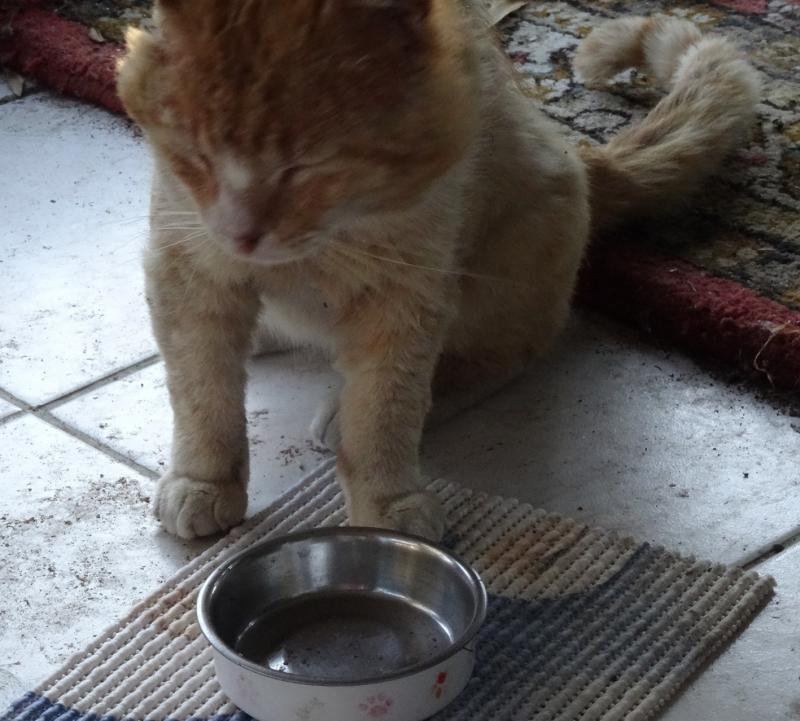 Ich habe auch meinen Service für Garfield erweitert. Da ich unserem Wasser aus dem Fliess nicht traue ( Oderwasser), steht jetzt neben den beiden Futtertellern eine Schüssel Wasser.