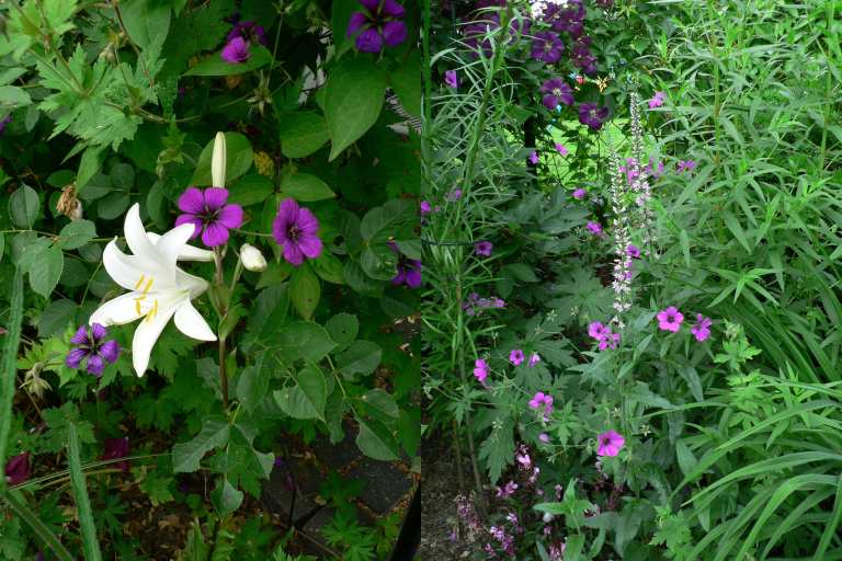 Besonders angetan hat mir die Kombination mit Frauenmantel, dem das Überwuchern nicht so viel ausmacht. Die gelbgrünen Blüten schieben sich irgendie durch und die Blätter sind ein schönes Polster. Viele andere Pflanzen, die bei den Annes stehen, werden umgeworfen oder erdrückt und haben mächtig zu kämpfen (Achillea, Agastache, Verbena bon.)