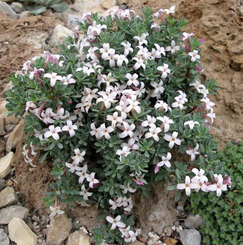 Die kriechende Form von Daphne jasminea. Im Gegensatz zu allen anderen Seidelbasten die ich kenne eine Dauerblüher. Leider ohne Duft.