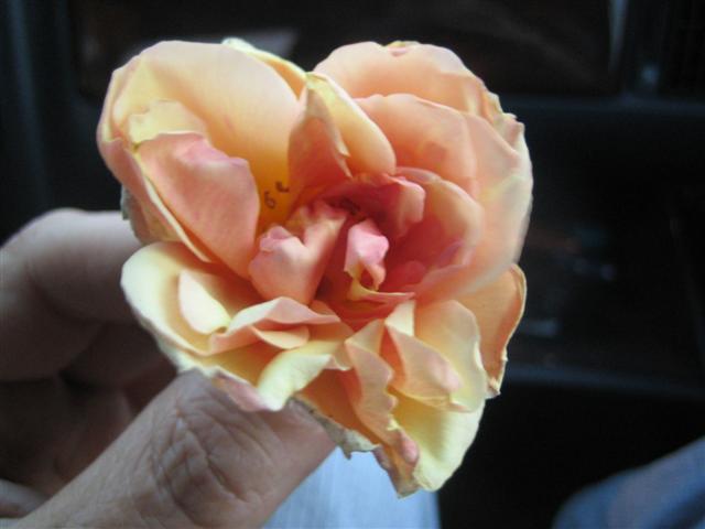 ich wüsste schon gern, worum es sich handeln könnte - weil mir etwas ähnliches noch nicht vor die augen kam.der blütenstiel ist jedenfalls glatt und die knospe länglich-schmal, was auf eine geringe füllung deutet...hier mal ein detail der schon etwas erschlafften blüte - sie lag auf dem amaturenbrett über nacht