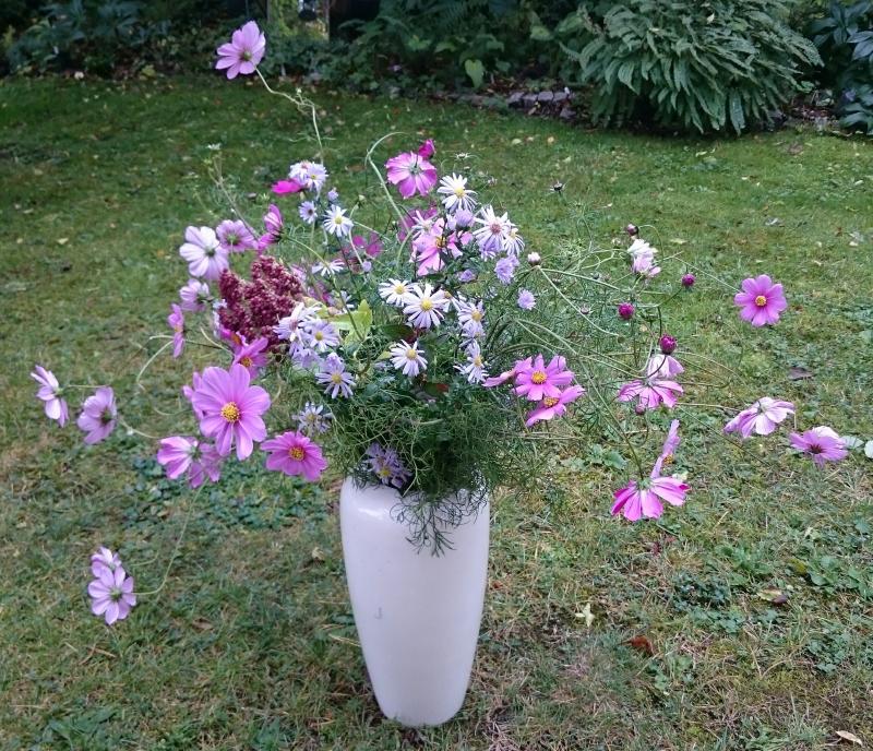 Meine Sträuße sind selten gebunden. Eigentlich wollte ich einen etwas wilden aus Cosmeen zeigen, aber ich habe die Spiegelungen im Fenster nicht bedacht. ;D