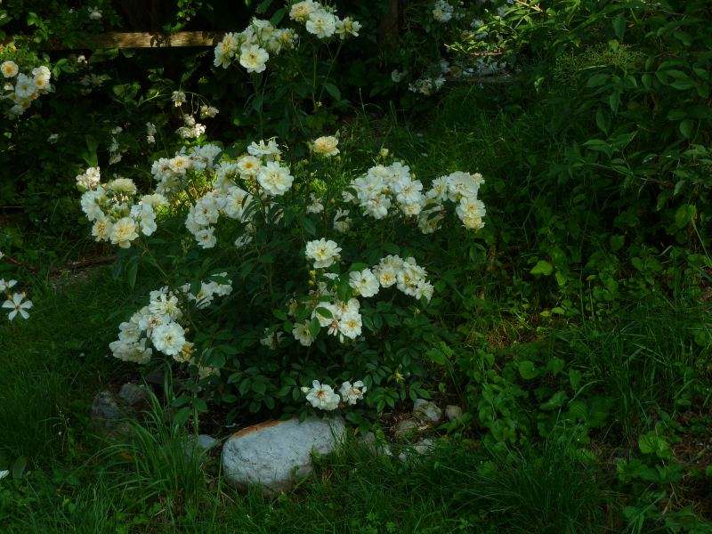 )und ungezählte Stauden und Sommerblumenpflanzungen nach unserem Einzug mein Kreuz ziemlich im A.... ist!  :-XAber jetzt summt und brummt es hier, wo vorher nichts als verdichteter Kies und Rasen war, Landwirtschaft halt, nix mit Bauerngarten, nur Maschinenabstellfläche, ganz pragmatisch.Zum Veranschaulichen habe ich unten noch ein 'kiesiges' Bild meiner geliebten Lykkefund. In Steine, Bauschutt (vom Aufschütten der Rampe) und Pferdeäpfel gebettet, ist sie nach so kurzer Zeit schon recht üppig, was mich vermuten läßt, dass viele Rosen wohl einen gerne durchlässigen Boden, aber mit einer gleichmäßigen Nährstoffversorgung schätzen.Da wir nur zur Miete wohnen, darf ich garnicht daran denken, was ist, wenn wir mal wieder hier weg müssen. Mache ich aber auch nicht...
