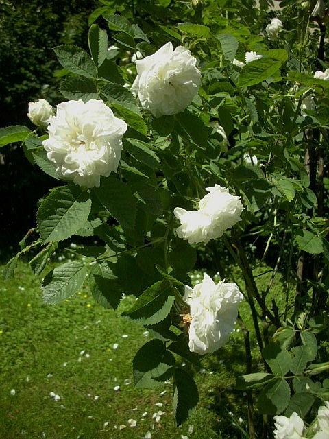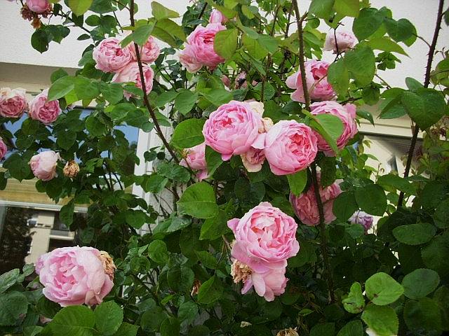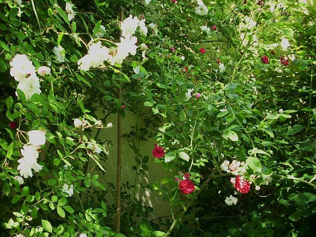 Wir müssen resistent bleiben. So richtig Platz für Sonnenanbeterfindet sich bei uns nicht. New Dawn und Souvenir du Dr. Jamainwachsen am Balkon zusammen mit Cl. Princess Diana (R.NewD) Rosa Ayrshire Queen u. die Ramblerrose Lykkefund sollennoch zwei Eichen erobern.Rosa arvensis 'Splendens' zusammen mit Parthenocissus an einer Kiefer.