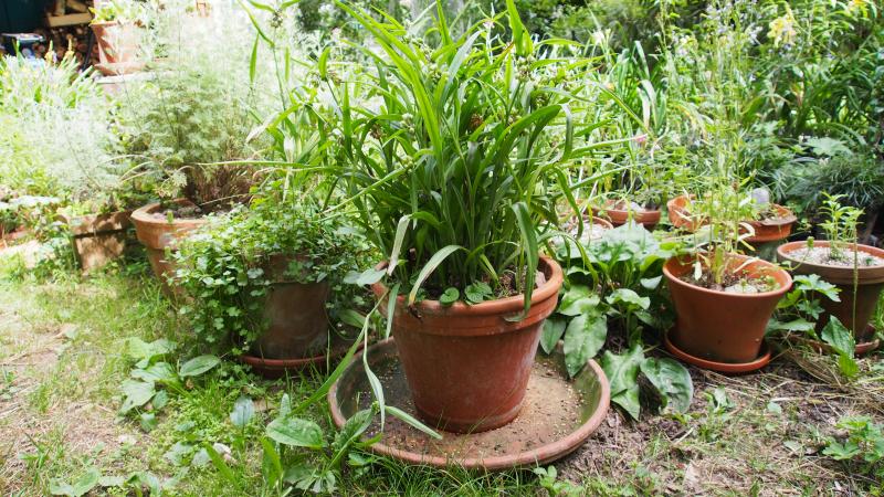 Kübelpflanzen so. Hier die Terrakottafraktion. Bei Tradescantia 'Osprey' ist der Untersetzter was groß. Die hat aber auch Durst!