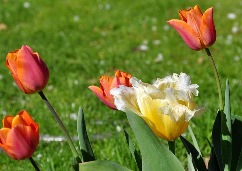 Im Herbst 2017 habe ich verschiedene Tulpensorten gesteckt. Ich war natürlich sehr neugierig, welche davon dieses Jahr wiederkommen. Auf dem Bild sieht man Brown Sugar und Sweetheart, die auch im Verblühen noch hübsch ist. Bei der war ich letztes Jahr unsicher, ob so elegante Blüten in meinen etwas struppigen Garten passen. In der Kombination mit den orangenen Tulpen gefällt sie mir gut. Sweetheart hat sich sogar etwas vermehrt, 29 Blüten - vor 2 Jahren hatte ich 25 Zwiebeln gesteckt.