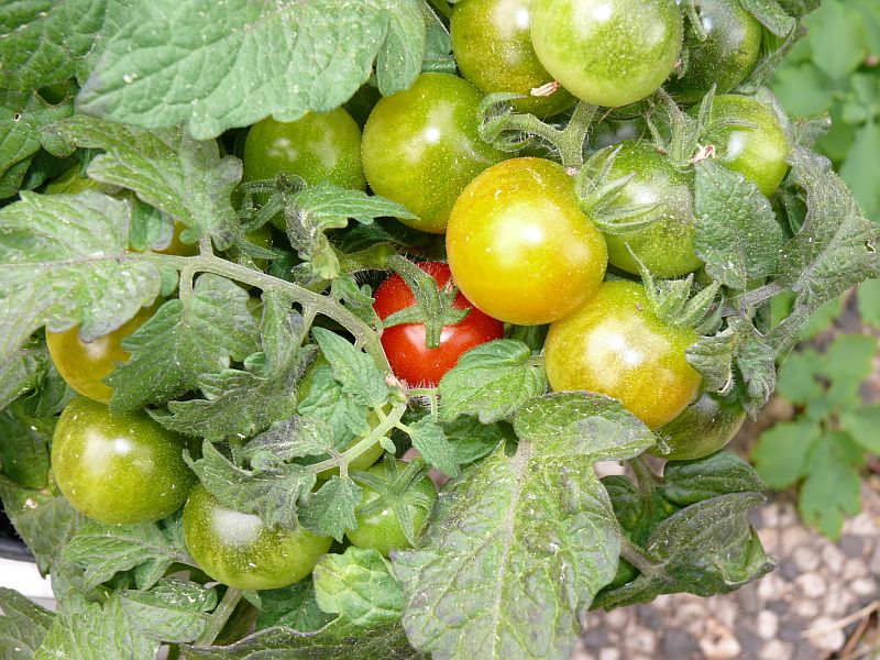 Die ersten beiden Pflanzen auf der Terrasse haben schon rote Tomaten und in den