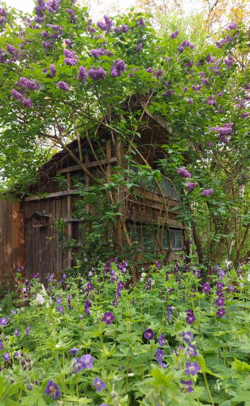 Am alten Bienenhaus blüht jetzt Geranium phaeum