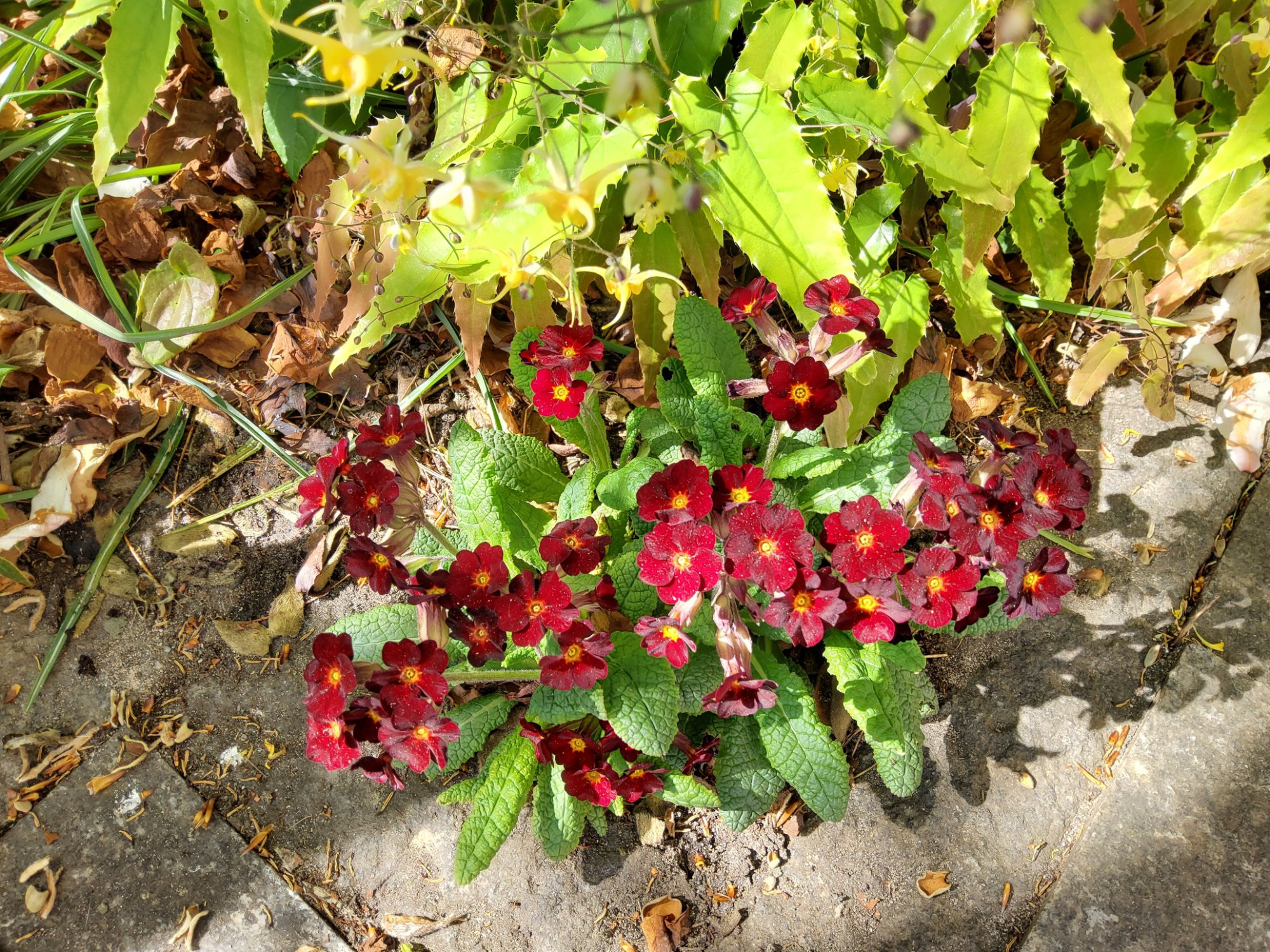 Ich setze Primeln gerne in Spalten, sie scheinen die Kühle der Steine zu mögen,