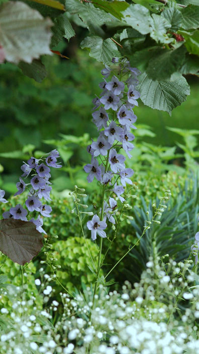 Dieser Rittersporn hat eine sehr verwaschene Farbe, aber dafür ist er selbst gezogen(vorne Schleierkraut, hinten Palisadenwolfsmilch, drüber Haselnuss)