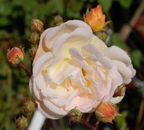 Roserai de l'Hay hat eine schweren Stand und sich in zwei Jahren doch zwischen einer Pallisade und einem Thuja hervorgewachsen um nun ein ganzes Feuerwerk an leuchtenden Blüten loszulassen.