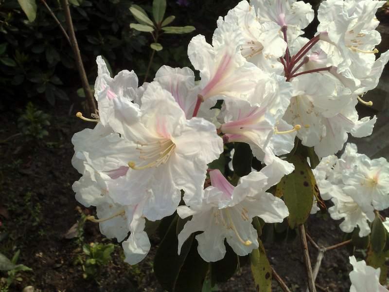 Noch die von mir aus gesammelten Samen gezogene Rh.decorum Bu284 aus dem Wenbishan in 3000m Höhe (Yunnan/PRC).Die Blüte hat schöne rosa Adern.Ich habe aus dem Samen ca.40 Pflanzen und ich studiere noch inwieweit Wuchsform,rosa Flash der weißen Blüte etc.vom Standort und jährlichen Klimafaktoren abhängen oder ob der Samen an sich Pflanzen mit unterschiedlichen rosa Anteil in der Blüte und mehr oder minder wüchsige Pflanzen hervorbringt.Die gezeigte Pflanze seht vollsonnig.Im Schatten stehende sind blühfaul ,selbst bei über 2m Höhe.