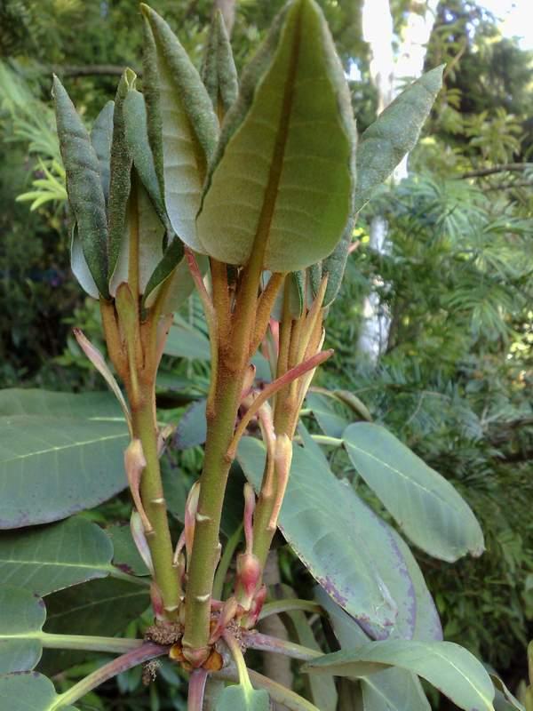 Auch Austriebe können für fehlende Blüten entschädigen: Rh.lacteum Corsock Klon