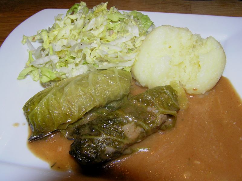 bei uns gabs heute krautwickel (mit wirsing statt weißkraut) mit kartoffelknödel und endiviensalat.