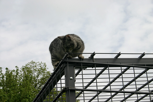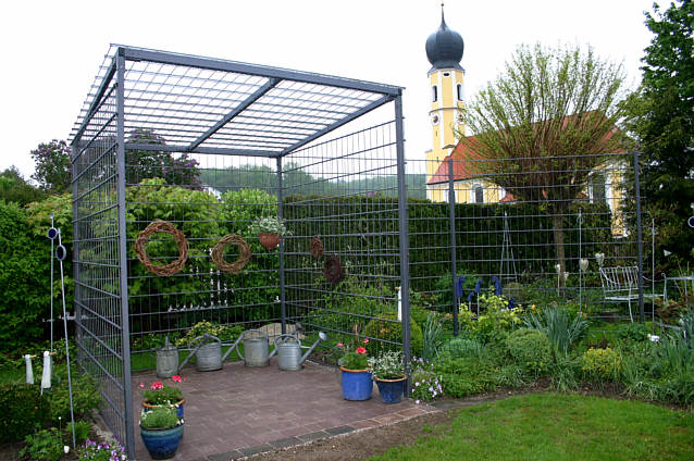 Hallo graugrün !Der Pavillon wird hoffentlich ganz schnell zugewuchert mit Kletterrosen und Clematis, die hängen ja auch runter. Darum ist der Affenkäfig (sage ich immer) so hoch, damit man dann auch noch geraden Hauptes durchgehen kann. Aber Seppi gefällt er, er liegt so oft drinnen und genießt es.lg. elis