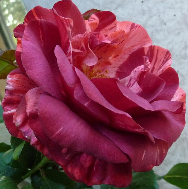unten vorm Haus hat die Simstripe (Grimpant Brownie) mittlerweile ihre 3. Blüte geöffnet. Die erst wurde für Zuchtversuche unseres Kindes in Anspruch genommen (Honorine de Brabant war Pollenspender, das kann lustig werden, 2 verschieden gesprenkelte Kletterer!