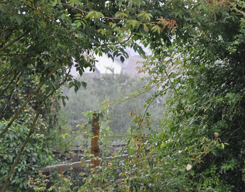 Beide Judasbäume, der rot- und blaublättrige haben immer noch gerollte Blätter, dabei ist jetzt wohl genügend Regen herunter gekommen und hat die Trockenheit endgültig abgelöst. Ob die sich wohl wieder etwas erholen.Die Blätter des Taschentuchbaums zeigen sich wieder fast normal, hier ging es schneller mit der Erholung.Gestern Abend gabs ein fetter Platzregen bei schwarzem Himmel mit Blitz und Donner, innert kurzer Zeit fielen bindfadenartig 22 lt vom Himmel! Die Steinwege standen zeitweise bis zu 10 cm unter Wasser.Hier mal ein Ausguck durch das Rosenfenster, während des Platzregens. Leider hat das Runterpixeln die Bindfäden etwas aufgehoben.