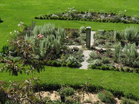 von oben gesehen, hier stehen ca 40 Teerosen in Töpfen.Das Rundbeet wird ein Teerosenbeet mit gleben und gelblichen Teerosen.