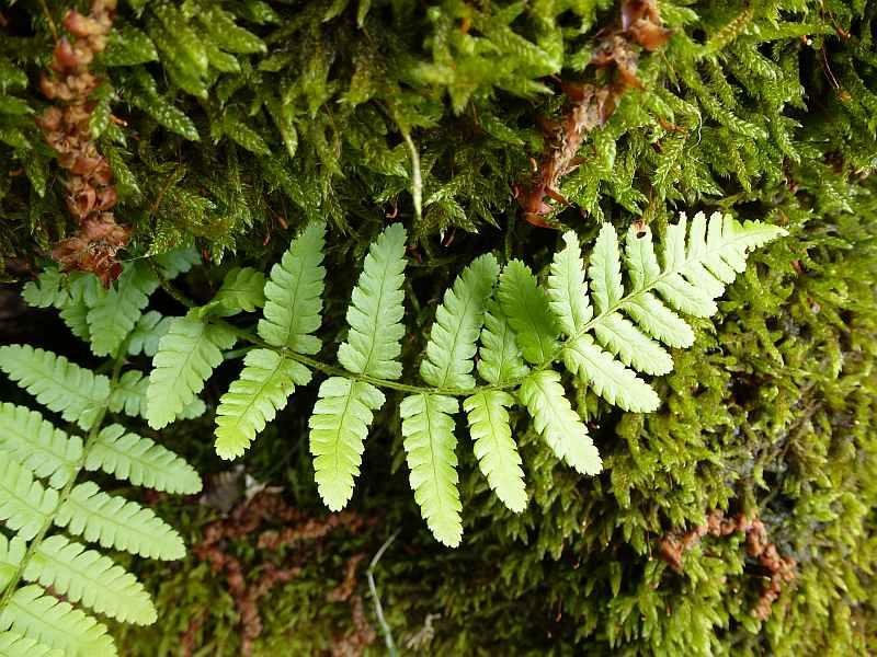 und diesen Jungfarn kenn ich nicht ... kam angeflogen ... Untergrund ist Birnentotholz.Könnts ein Eichenfarn (Gymnocarpium dryopteris) sein ?