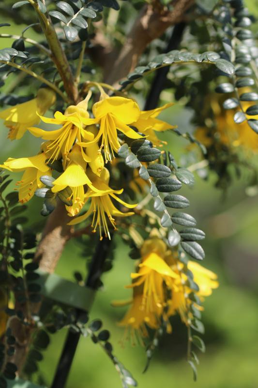 Sophora microphylla "Sun King" wohnt hier im Topf. Jetzt öffnet die Blüten. Die sind wirklich sehenswert. Aber auch ohne hat es eine tolle Laubstruktur.