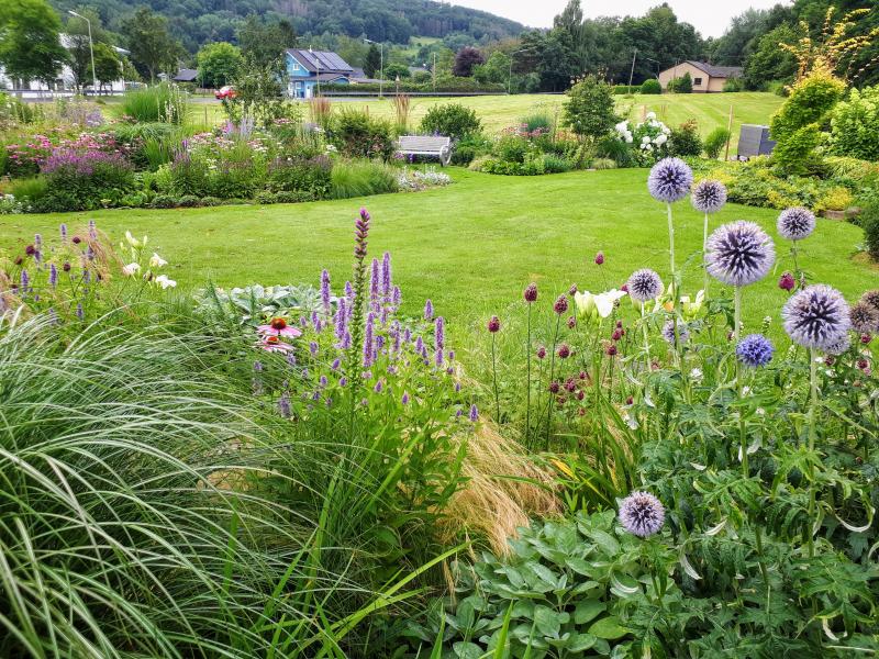 A.s. stelle ich mir sehr schön in der Wiese vor. Ich habe nochmal auf meinen Bildern der letzten Jahre geschaut, da war die Hochzeit der Blüte immer in der ersten Juli-Hälfte (dieses Jahr jetzt erst). Auch wenn's zum Ausreifen der Samen nicht reicht, würde ich den Versuch trotzdem starten, denn die vermehren sich auch gut über Tochterzwiebeln. Außerdem könntest Du ja einen Flecken stehen lassen und die ausgereiften Samen später per Hand über die Fläche verteilen.