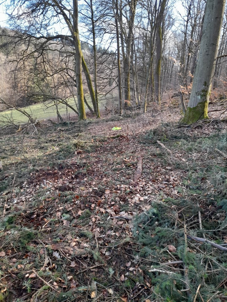 Wie im Short beschrieben war der Douglasienriegel ehemaliges Grünland. Als wir das Stück in Pacht übernommen haben (zeitgleich mit dem Erwerb durch den NABU), lagen schon 2 Baumleichen auf dem Grünland, das übrigens brach gefallen war. Da ist mit dem Trecker kein Hinkommen. Es war mein Mann mit einer Wwooferin, die die Bäume in Häppchen zerlegt haben, und in den Baumbestand geworfen haben. Also Handarbeit. Von den Bäumen waren mehrere krank. Drum hier noch die Warnung: Wer meint Douglasie sei der Zukunftsbaum und das Allheilmittel: Sorry, die hatten irgendeinen Käfer. Nicht alle. Aber 2 oder 3. In dieser Situation gab es nur eine Lösung: Weg damit. Man kommt von oben hinten mit einem Harvester ran. Und dewegen hat der Naturpark eine Ausschreibung gemacht. Leider sind die Holzpreise nicht so, dass eine Entsorgung des Kleinkrams drin war. Und deswegen stehe ich vor dem jetzigen Salat. Ich hoffe auf Wwoofer und ganz ehrlich auch darauf, dass meine Wollbiber die Naeln futtern. Weil ausgewachsene Douglasien echt lange Äste haben. Und die haben Gewicht und müssen hangaufwärts.