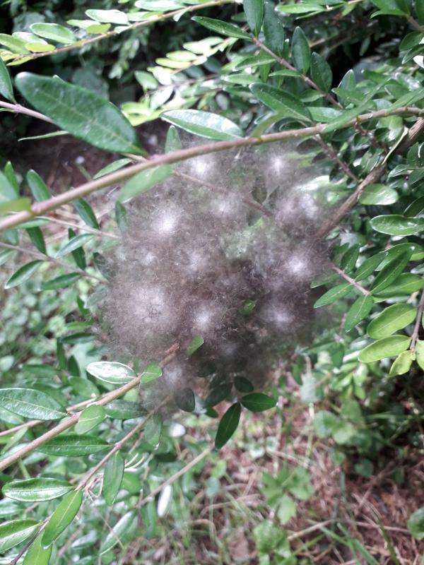 ..................Etwa dreißig Zentimeter über dem Erdboden in halbschattiger (nur Morgensonne), geschützter Lage fand ich dieses 'Gelege'. Es vergrößerte sich bei den warmen Temperaturen der letzten Tage und mittlerweile ist es verschwunden, es hängen nur noch einige 'Gespinstfetzen' am Strauch.