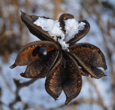 Gerade beim Rundgang und Nachsehen vorhin, fielen mir die Samenstände wieder mal besonders auf.Bis auf eine am Strauch, schneide ich die anderen Kapseln nach der Blüte ab.Von weiss über braun zu schwarz und etwas Sonne darauf: