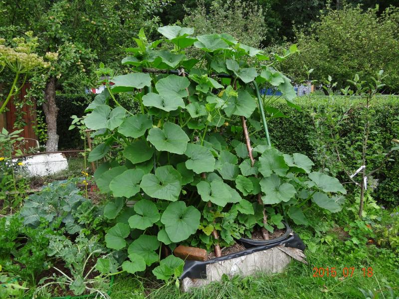 Mein diesjähriger Kürbiswahnsinn, vier Pflanzen, erstmalig am Gerüst gezogen (so war jedenfalls der Plan), inzwischen machen die, was sie wollen, ich misch mich da nicht mehr ein: