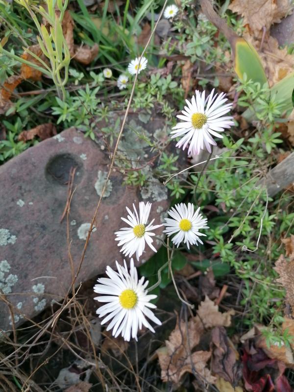 Bellis sylvestris. 25cm hoch, Blüten in Asterngröße. Während man in Carrara unterhalb der Marmorsteinbrüche normalerweise die Besucherinfo mit Souvenirshop besucht, streunen die nicht so Normalen durchs Gebüsch gegenüber und stechen sich von den zahlreichen Bellis ein Teilchen ab. Das ist schon ein paar Jahre her. Im August war es mir verdorrt. Ein italienisches Gewäxx in Germania vertrocknet :P Doch nach dem Regen.... :-*