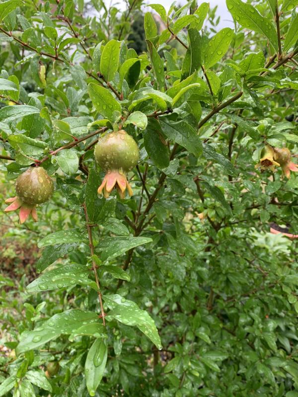 Wird wahrscheinlich nix werden mit reifen Granatäpfeln. Der Fruchtansatz ist zwar gut (sicher über 25 Granatäpfel), aber die Früchte sind in einem Stadium wie sonst Anfang Juli, max. walnussgroß. Da reichen Zeit und Wärme im Herbst wahrscheinlich nicht aus. Ein hübscher Anblick mit gleichzeitig Früchten und Blüten bleibt der Baum wenigstens :)