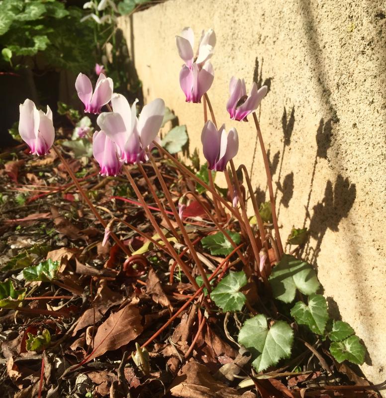 Die meisten Cyclamen blühen hier vor dem Laubaustrieb, wie auch dieses C. hederifolium ssp. crassifolium. Das Laub auf dem Bild (von gestern) ist von Sämlingen.