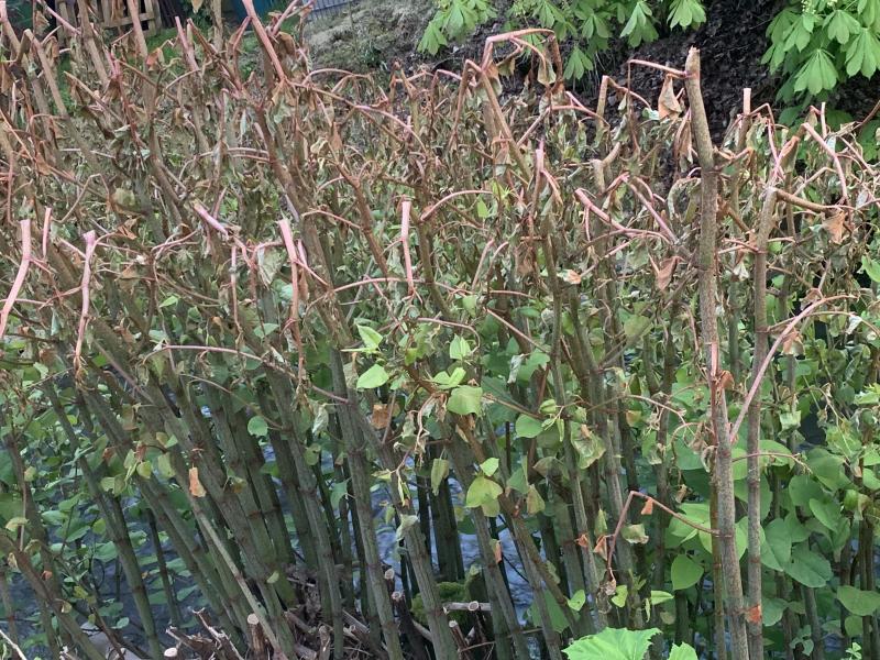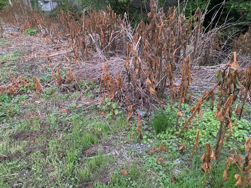 Es gibt Sachalin-Knöterich (Fallopia sachalinensis) und Japanischen Knöterich (Fallopia japonica), beides sind ähnliche Arten, und es gibt offenbar auch eine Hybride (Fallopia × bohemica). Der Sachalin-Knöterich ist wohl noch etwas größer als der Japanische Knöterich, was man im Handel bekommt, lässt sich vermutlich kaum bestimmen. Hier fällt der Austrieb auch oft solchen Spätfrösten zum Opfer, was den Knöterich freilich nicht besonders beeindruckt, er treibt dann einfach neu aus und bleibt für das betreffende Jahr etwas spärlicher als sonst.
