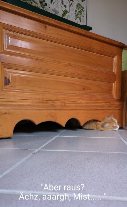 Denn allabendlich werde ich nun "von Madam mit Meckern und "Ichrollmichundbinniedlich" zum Gartentisch beordert. (Der ist toll, hat man entdeckt, weil seine gerippte Platte angenehme Lüftung von unten erlaubt, und wir freuen uns schon aufs nächste Grillen mit Tischbeseetzerin : ::) ;D).