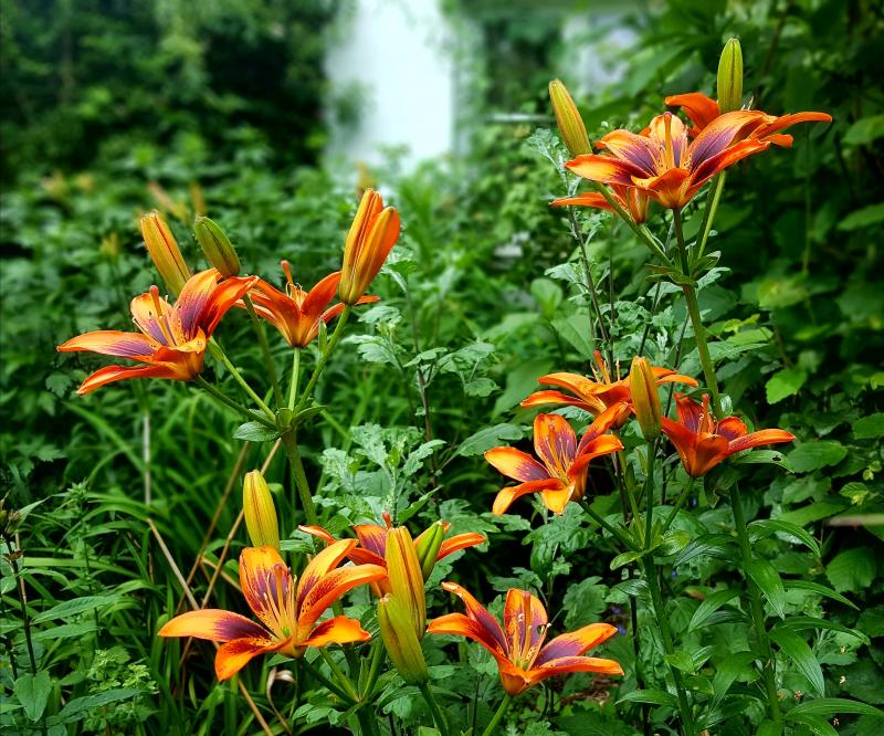 Unbekannte asiatische Hybride , leuchtendes Orange im grünen Dickicht.