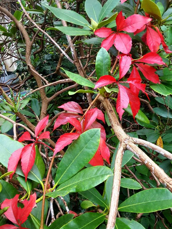 Parthenocissus quinquefolia mit leuchtenden Rot im Rhododendron