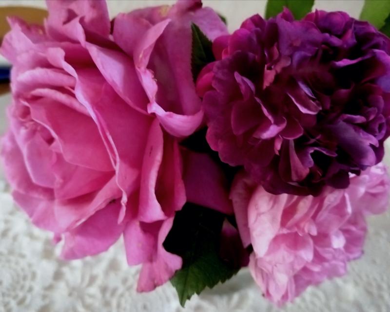 Links ältere Blüte von Parfum Flower Circus, Mitte Tuscany Superb, rechts Fundrose, die bei dem täglichen Regen fast nur Mumien produziert. :(