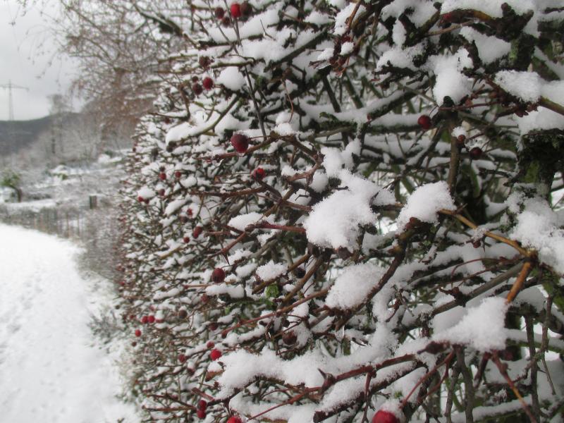 mit ein wenig Schnee wirkt die Weißdornhecke recht malerisch.