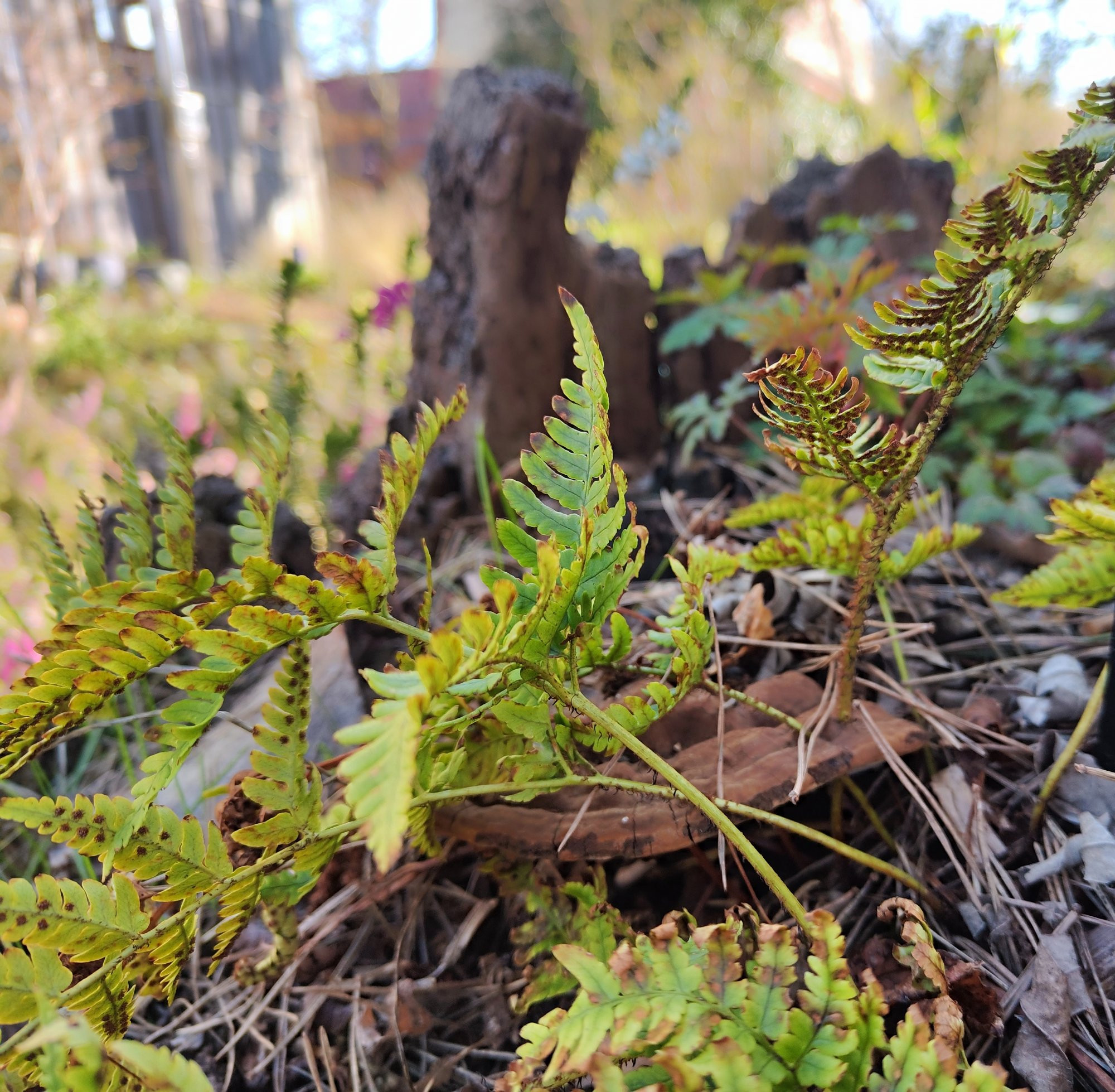 Den Dryopteris bissetiana pflanzte ich in den Mulm eines Baumstumpfes. Ergebnis: "Farn durch Schwamm" oder "Schwamm umschließt Farn".
