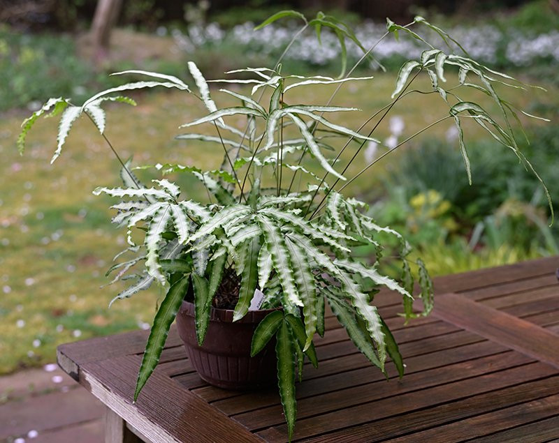 Den Pteris cretica 'Albo Lineata' habe ich bei Wouter van Driel als Freilandfarn gekauft, das war nix. Jetzt hat er den zweiten Winter in der Waschküche verbracht, dort gefällt es ihm.