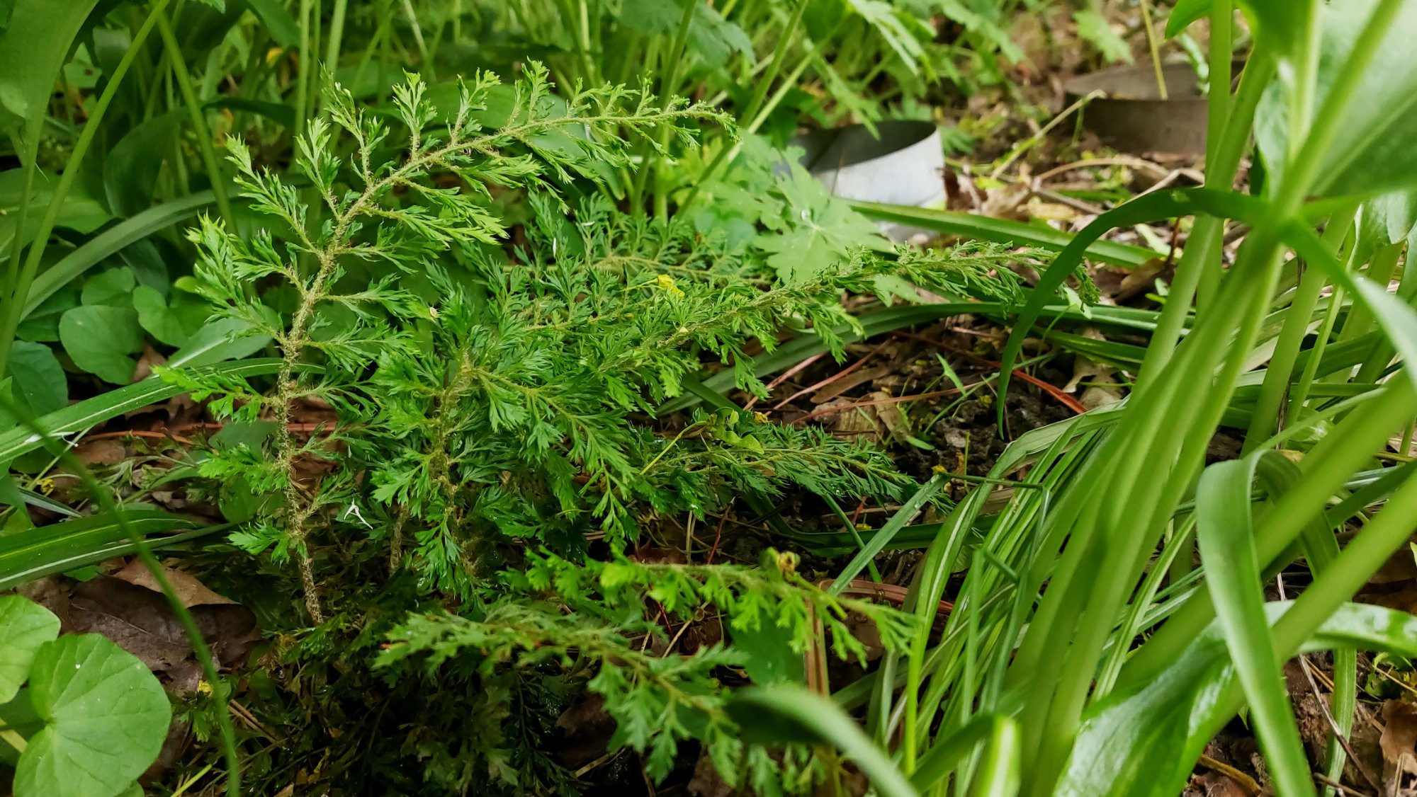 Nepalschwarzschuppenfarn, auch dessen letztjährige Wedel - in Bild 1 unten - brauchen noch keinen Platzverweis zu befürchten.