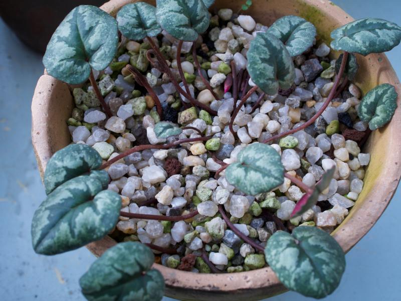 Cyclamen alpinum (imSommer im Topf ungeschützt draußen im Schatten) zeigt schon seit einiger Zeit Blütenknospen.