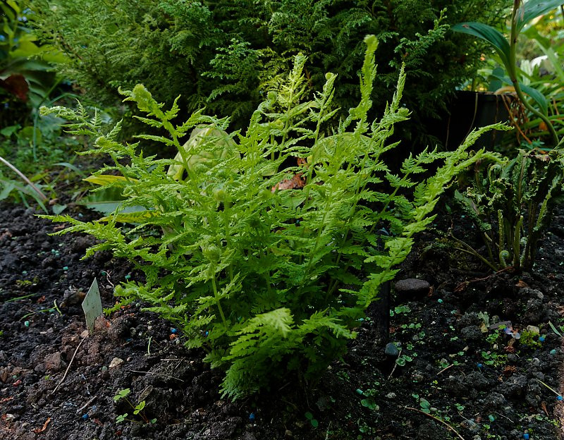 Es wunderte mich nur, dass die anderen Wedel mir nicht schon die Jahre vorher aufgefallen sind….allerdings stand er da hinten im Farnbeet, weil 0815-setiferum, und da waren sie vielleicht noch nicht so groß.