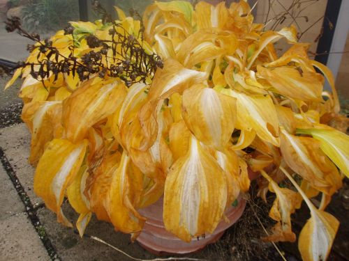 So sieht der Herbst bei mir aus; Krötenlilien, im Hintergund die kräftige, gelbe Herbstfärbung der Hostas und dieser niedlich Falter namens Gammaeule oder so...