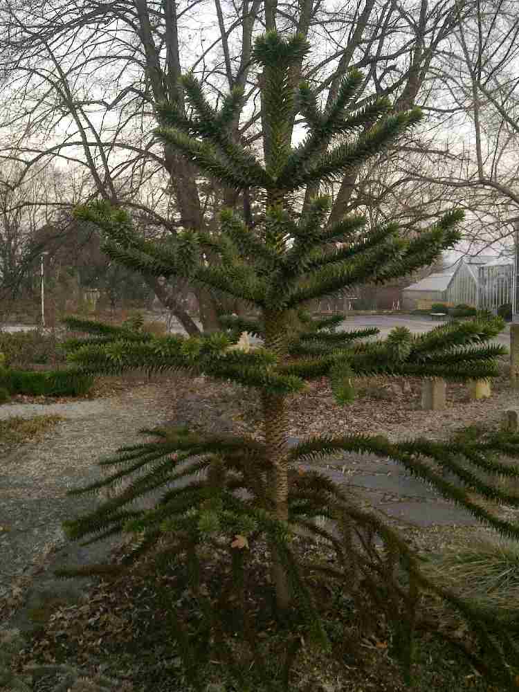 Diese ca. 2m hohe Araucarie im Park der EGA Erfurt hat offenbar keinerlei Winterschäden. Die Triebspitzen sehen alle knackig grün aus, lediglich an den ältesten Ästen (allerdings auch dort nicht an den Triebspitzen) gibt es einige braune Stellen. Geschützt steht sie nicht und der Park liegt gegenüber der Stadt erhöht und recht windig.