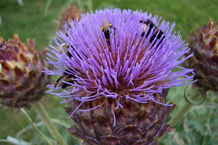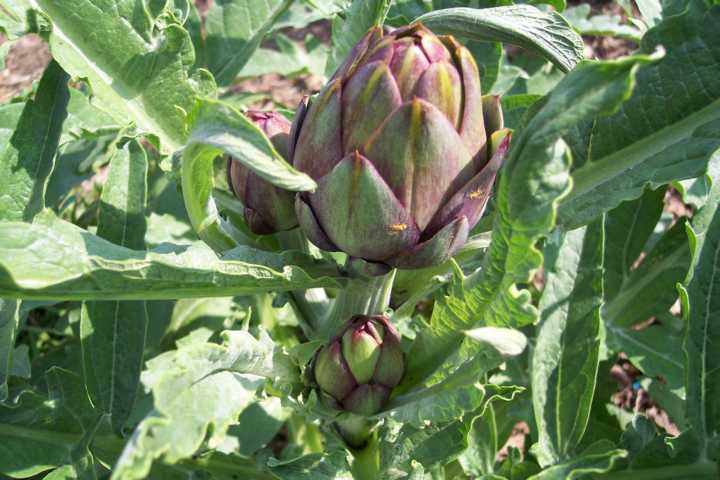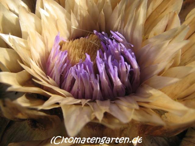 einige artischocken haben die ernte überstanden und zeigen zaghaft die ersten blütenblätter:
