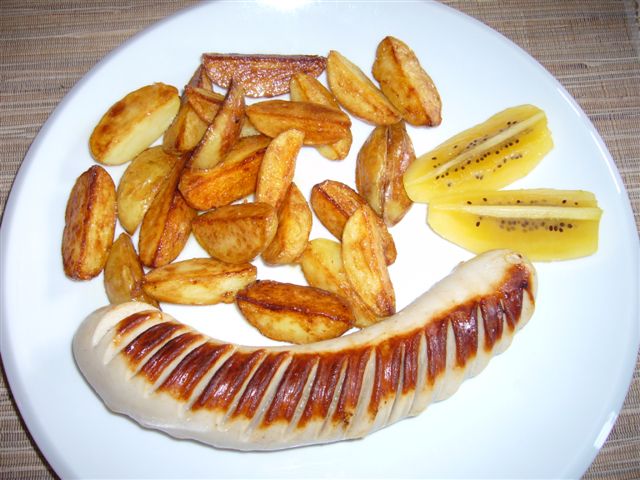Heute:Bratwurst mit Bratkartoffeln, das hat sich mein Nachbar-Junge gewünscht, und ja nichts grünes oder rotes dazu ::)danach eine Aprikosen-Joghurtcreme