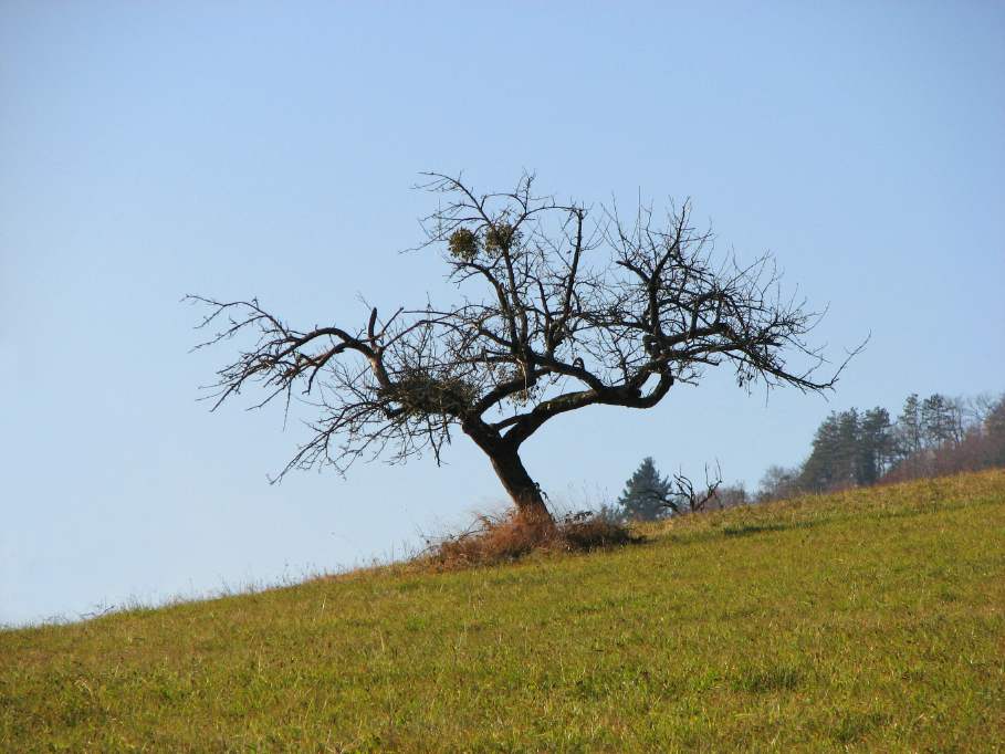 Hier nochmals eine Gegenlichtaufnahme des knorrigen Baumes von gestern. Gut möglich, dass er seine Mistelzweige bald los wird. Hoch ist er nicht und mit einer Astschere am Teleskopstiel dürfte es kein Problem sein, sie wegzuschneiden.Gruss Christa